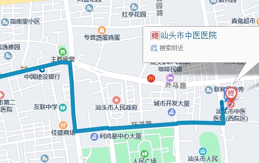 汕頭老城460米向東步行 到 汕頭開埠文化館3站乘 1路 (洋濱方向) 到 外馬新興路口270米向東南步行 到 汕頭市中醫(yī)醫(yī)院汕頭市中醫(yī)醫(yī)院