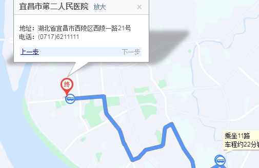 宜昌東火車站步行 300米,宜昌東站5號(hào)站臺(tái)站 上車B613路 10站南苑小區(qū)站 下車步行 110米,南苑小區(qū)站 上車11路 末班發(fā)車21:00 11站二醫(yī)院站 下車,步行 70米到宜昌市第二人民醫(yī)院
